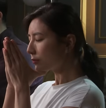 두 엄지로 턱을 받치고 턱을 아래로 내리누르면 힘이 앞으로 기울면서 뒷목의 뻣뻣함이 풀어진다